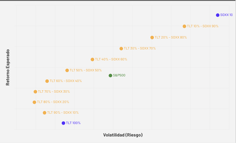 Un portafolio diversificado puede lograr un mejor balance de riesgo y retorno. Por ejemplo, combinar el ETF de semiconductores SOXX (mayor riesgo y retorno) con bonos del Tesoro de largo plazo TLT (menor riesgo y retorno) permite crear combinaciones más eficientes que el S&P500. Dependiendo del porcentaje asignado a cada uno, se pueden generar portafolios con igual retorno esperado pero menor riesgo, o con el mismo riesgo, pero mayor retorno esperado. Una gráfica de la frontera eficiente de estos dos ETFs muestra cómo ciertas combinaciones superan al S&P500.