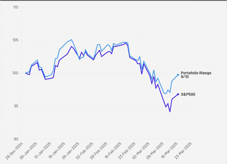 En lo que va del 2025, el portafolio de riesgo 8/10 de Insights ha tenido un desempeño notablemente superior al S&P500. Si analizamos $100 invertidos en ambas alternativas, observamos que el S&P500 ha caído más de un 3%, mientras que el portafolio de riesgo 8/10 ha caído menos de un 0.5%.