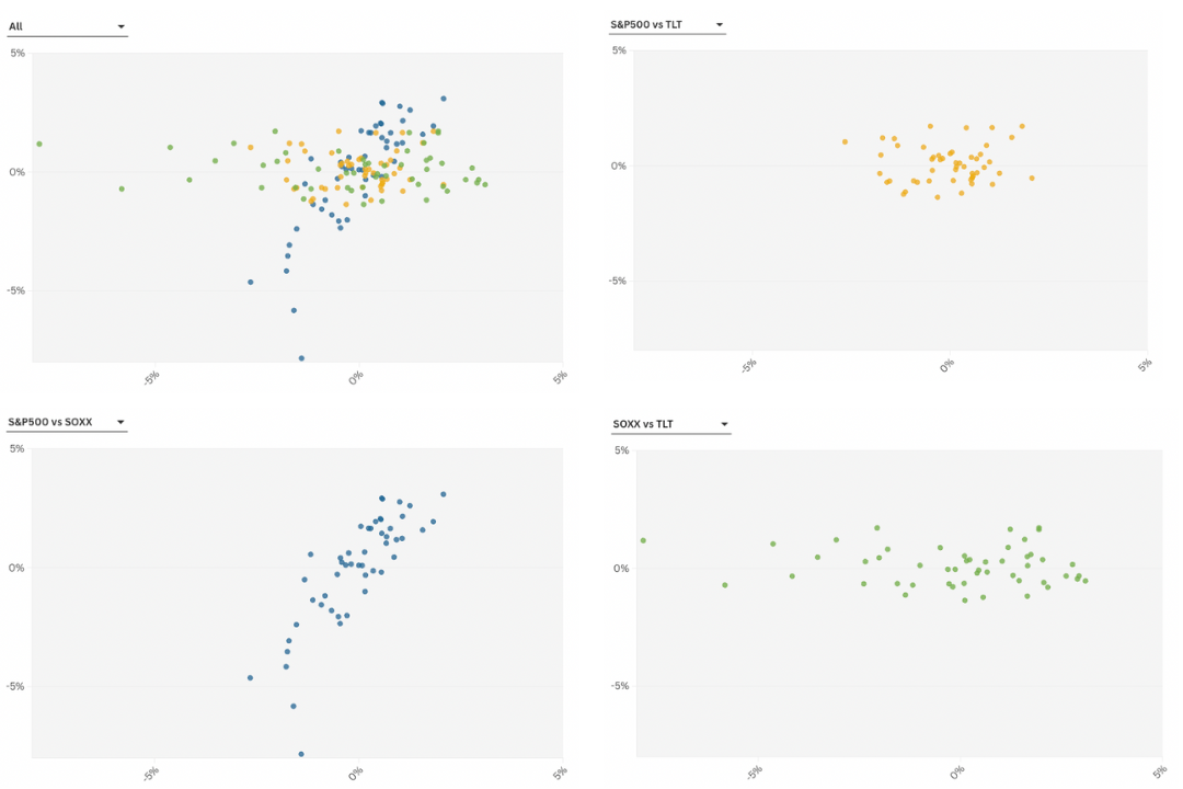 El beneficio de combinar SOXX y TLT radica en su correlación negativa: cuando uno baja, el otro tiende a subir. Esto no ocurre con el S&P500, que tiene correlación positiva con SOXX y una relación más débil con TLT. En otras palabras, SOXX se mueve más agresivamente que el S&P500, mientras que TLT se comporta de manera independiente, aportando estabilidad al portafolio.